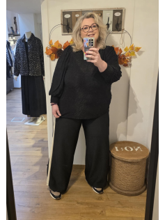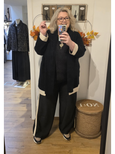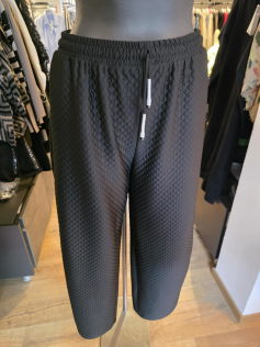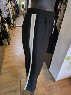 Pantalon matelassé forme de jambes larges super tendance. Bande en simili blanc cassé sur le côté. Taille élastiquée avec lien de serrage. En 100% polyester.