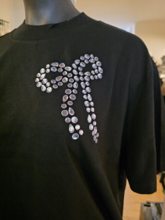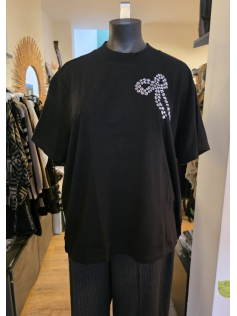 Tee-shirt forme boxy (un peu ample) en coton noir avec un noeud en strass sur le côté. Hauteur : 74 cm.