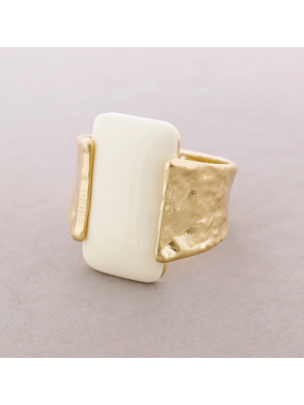 Manchette rigide en métal doré mat sans nickel et perle en plexi. Convient jusqu'à 21 cm de tour de poignet.