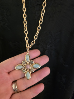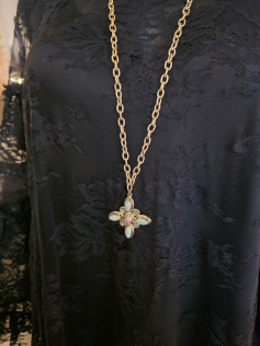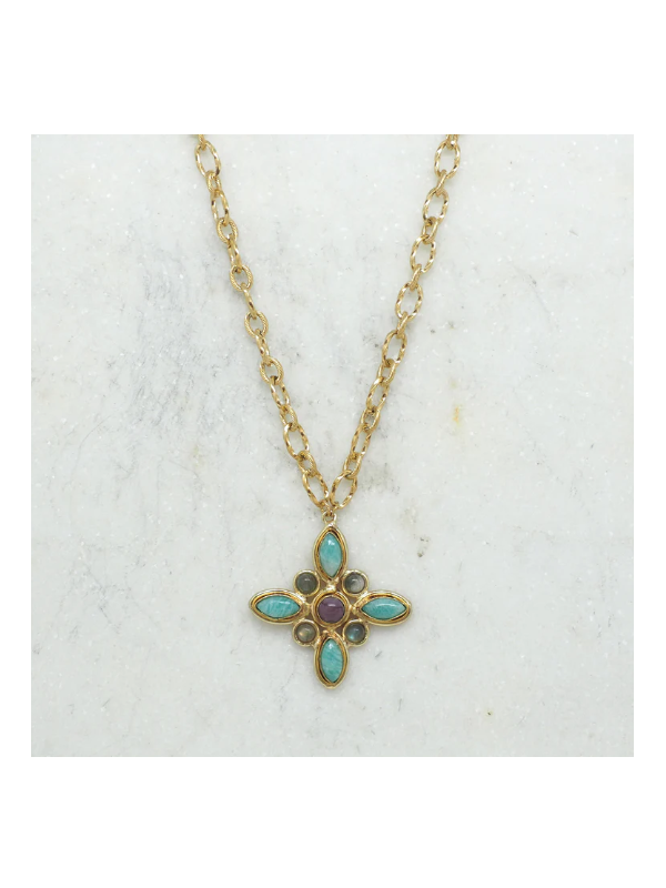 Long sautoir en laiton orné d'un médaillon de pétales en labradorite, amazonite et rhodonite. Fabriqué à la main à Paris