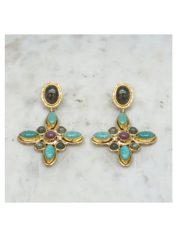 Boucles d'oreilles clips en laiton ornées de pétales en labradorite, amazonite et rhodonite. Hauteur : 7 cm. Elles ne compriment pas le lobe. Fabriquées à la main à Paris