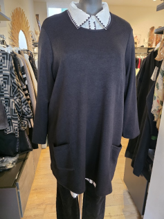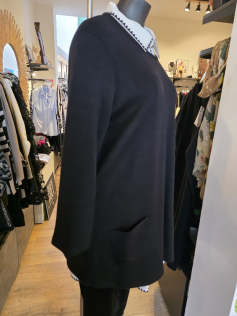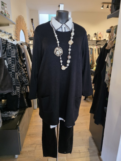 Pull de magnifique qualité, agréable et doux. Forme un peu évasée avec deux poches plaquées devant façon tunique. En 40% viscose, 40% rayon et 20% polyamide. Longueur environ 88 cm. Facile à porter et passe-partout mais tellement chic. Ce qui est intéressant c'est la chaleur sans le lainage ou tricot.