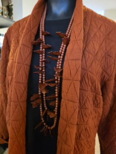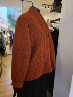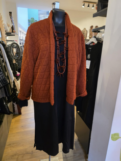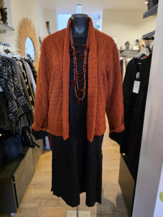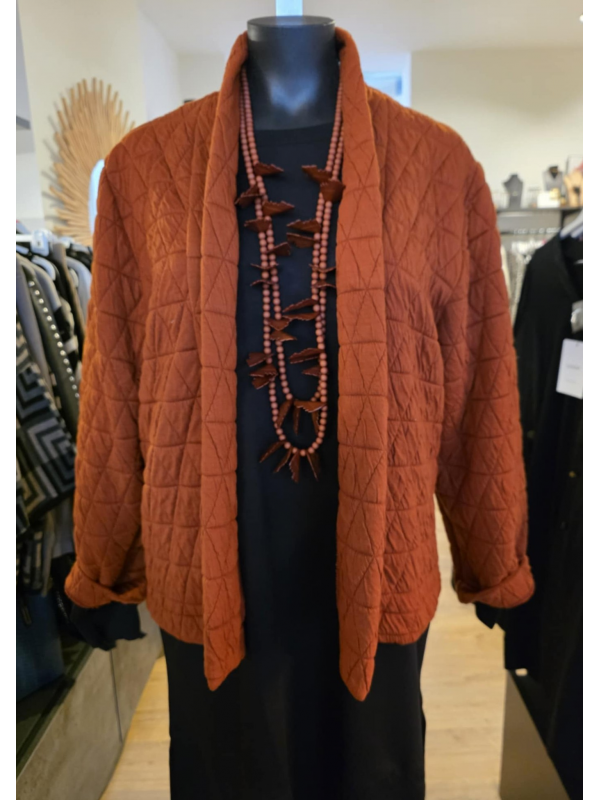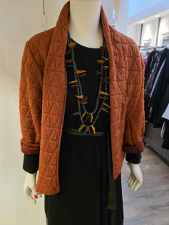 Très beau gilet dans un magnifique tissu matelassé mais pas trop épais. Forme boléro avec col châle et fermeture bord à bord. En 60% viscose, 30% polyamide et 10% élasthanne. Hauteur : 71 cm. Il agrémentera toutes vos tenues d'une belle couleur hivernale.