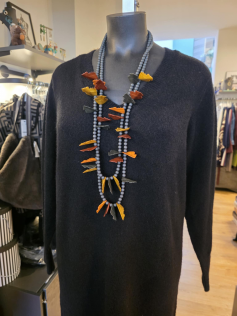 Collier en bois et résine double rang avec des feuilles, vraiment très sympa. Perles vert kaki clair.