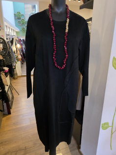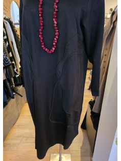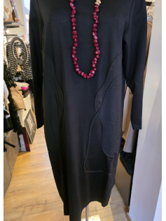 Si vous cherchez une robe noire passe-partout de très belle qualité alors vous l'avez trouvée car ce modèle a un tomber parfait et un tissu particulièrement top et un peu épais. En 60% nylon et 40% coton. Col V. Il y a un empiècement avec un autre tissu sur le côté niveau originalité. Forme un peu en A. Hauteur environ 110 cm.