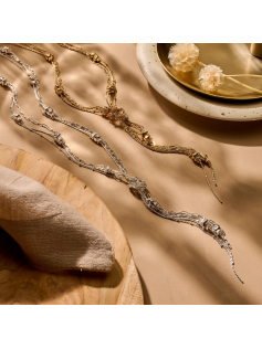 Collier très chic avec des chaînes en métal doré sans nickel. Hauteur totale 83 cm.