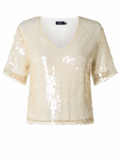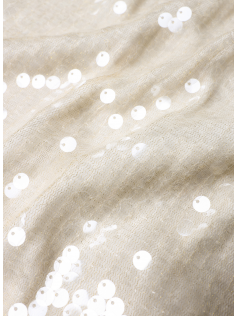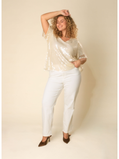 Blouse blanche à paillettes doublée, donc elle ne gratte pas. Les manches ont également une belle longueur. On peut la porter aussi avec une petite veste ou un petit tailleur noir pour remplacer le chemisier. Hauteur : 74 cm