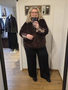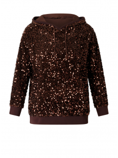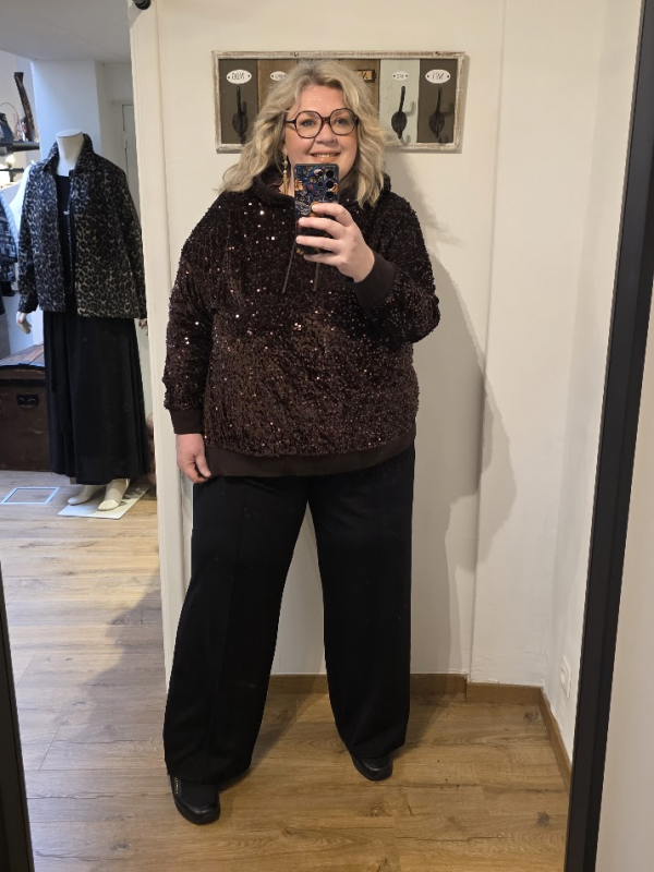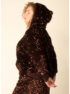 Sweat à paillettes avec capuche doublé donc on ne sent pas les paillettes sur le corps. En 95% polyester et 5% élasthanne. Sur la seconde photo je porte un sous pull très agréable qui donne un côté plus original encore au sweat. Hauteur : 70 cm. Couleur qui varie avec la lumière.
