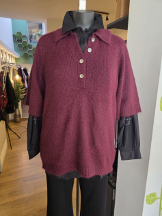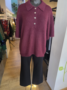 Pull tout doux bordeaux forme polo. En 64% polyester, 18% acrylique, 10% laine et 3% élasthanne. Très tendance avec un tee-shirt ou une chemise dessous. Il ne pique pas. Hauteur 76 cm.