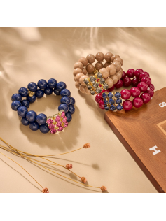 Bracelet élastiqué bien large en résine et avec des strass en verre bleu.