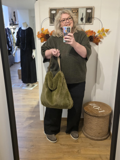 Grand sac fourre-tout en fourrure synthétique évidemment. Elle est de très belle qualité. A porter à l'épaule. Largeur 48 cm sur 45 cm de haut. Très beau vert mousse.