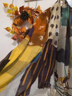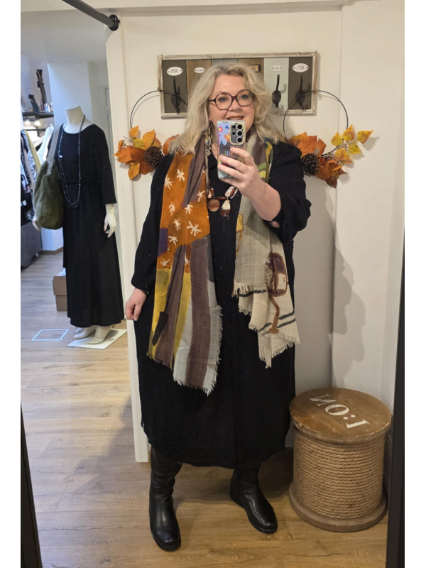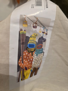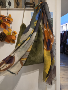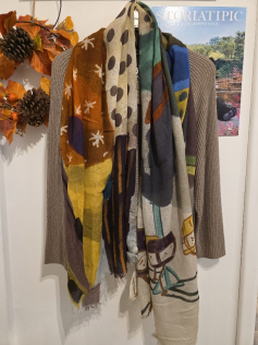 Super foulard unique et original représentant deux skyeurs avec des petits téléphériques en paysage. En laine et nylon. largeur 100 cm sur 180 cm de long.