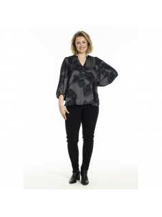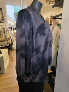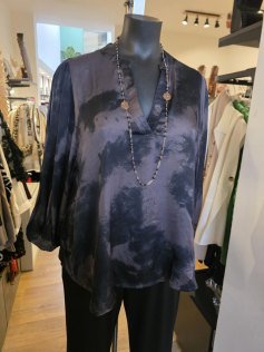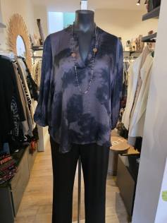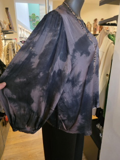 Très belle blouse taupe et noire toute légère comme de la soie. Magnifique tissu en 100% viscose.  Larges manches avec élastique à remonter pour un effet aérien. Hauteur : 68 cm