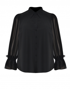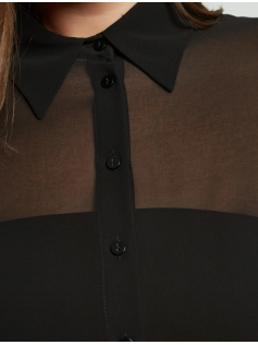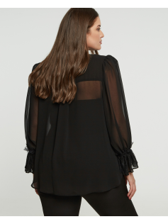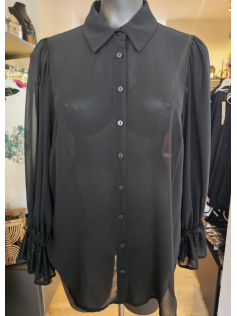 Dommage que je ne puisse pas vous montrer ce joli chemisier porté sur moi mais il est un rien trop étroit, même s'il taille plutôt bien. Il est tout en voile transparent (sur la photo le mannequin porter un top). Ce qui est magnifique ce sont les manches et le côté léger du chemisier. Vous pouvez ainsi le porter sur des pulls et des débardeurs, et évidemment seul avec un top. Il est très classe. Hauteur : 69 cm.