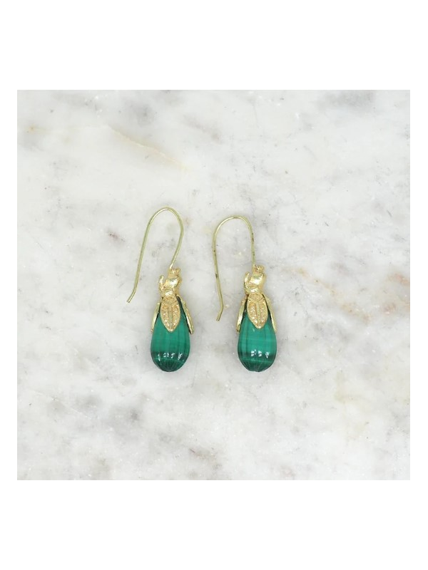 Boucles montées sur grandes dormeuses en laiton dorées à l'or fin. Goutte en malachite. Hauteur environ 4.5 cm.