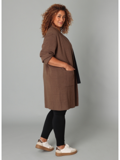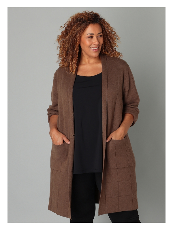 Si vous cherchez un gilet de haute qualité, choisissez celui-ci. La matière est top, quand même chaude, il ne peluche pas. Il y a des lignes façon carreaux ton sur ton, c'est très élégant. Il est boutonné, ce qui est rare et bien long. Petit col châle. En 50% viscose, 28% polyester, 22% nylon. Hauteur : 96 cm.