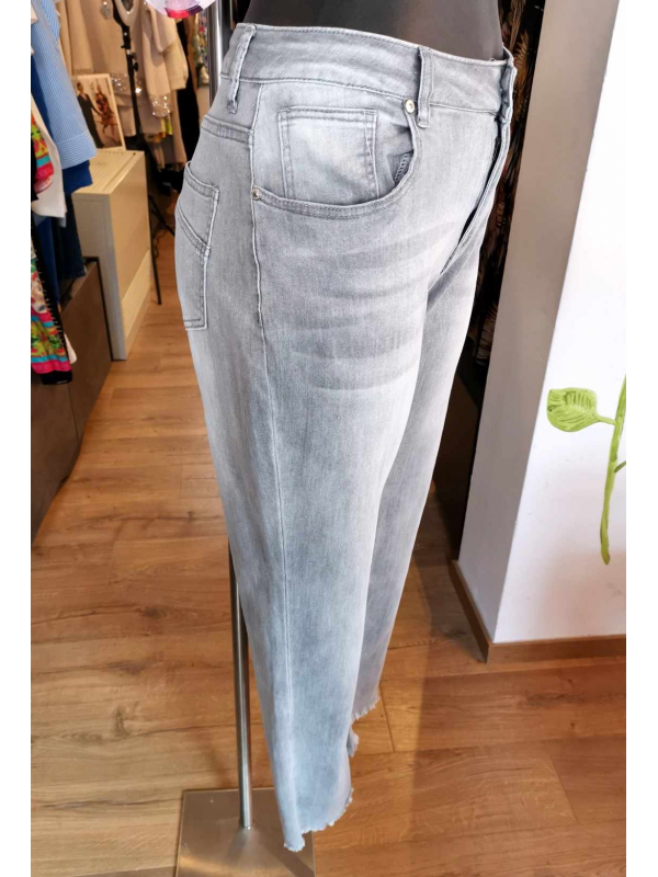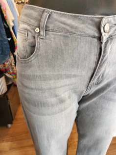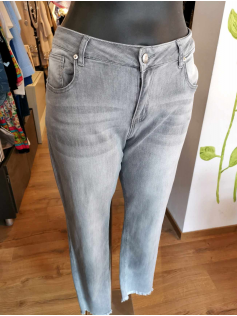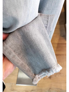 jeans gris très souple et élastiqué avec élasthanne et petites franges dans le bas pour la finition. C'est un joli changement au jeans délavé et il va avec tout. Son prix est aussi très sympa. Entrejambe environ 80 cm. Si vous êtes plus petite ou n'aimez pas les franges, on coupe pas de soucis ;-)