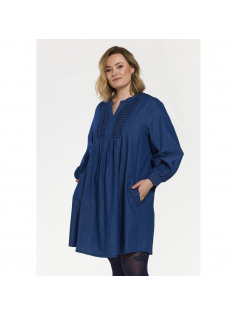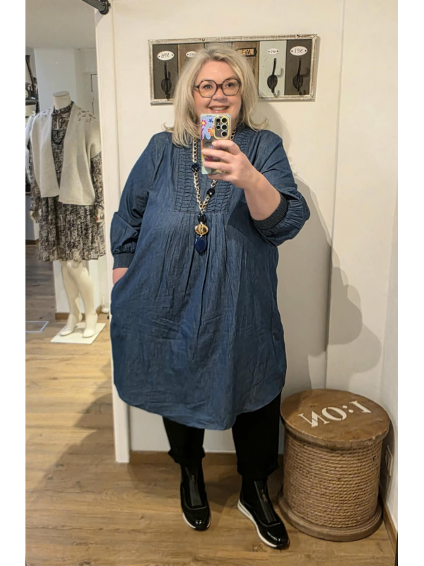 Tunique ou robe en jeans mais en viscose. Très agréable à porter. Avec poches latérales, manches bouffantes mais pas trop et élastiques pour remonter les manches. En 100% viscose. Longueur : 93 cm