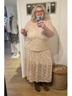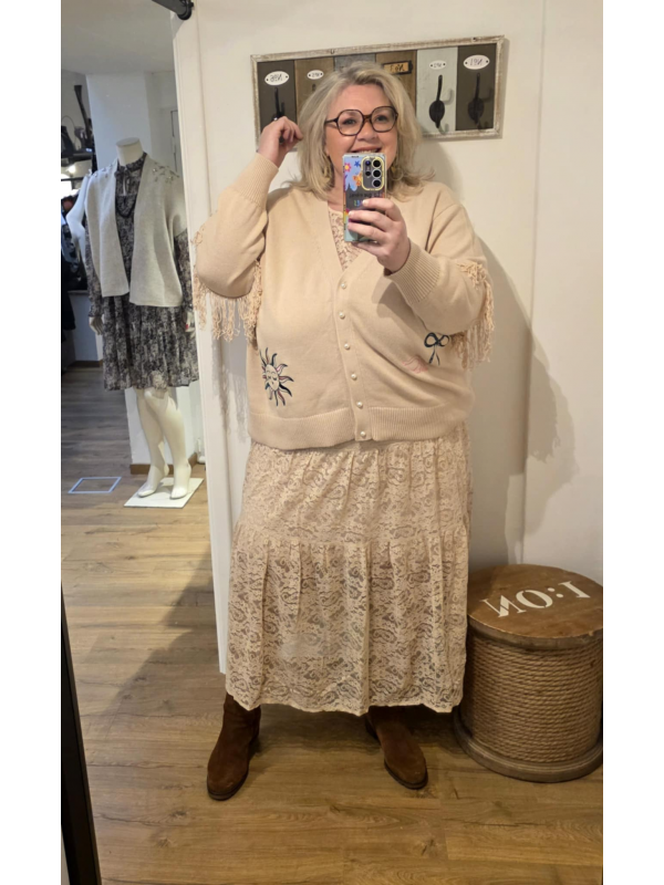 Très belle jupe en dentelle beige/écru doublée jusqu'au bas du genou. Large taille élastiquée. Présentée dans le live je n'ai pas encore de photo de la jupe seule mais elle est très parlante, je la mettrai plus tard. Longueur : 90 cm.