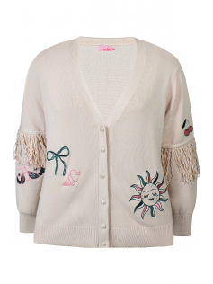 Magnifique cardigan en 100% coton. Beige avec des boutons perles. Broderies roses et vertes sur le devant et les manches (cerises, petits noeuds, soleil, papillon) et franges sur les manches. Modèle très original. Hauteur environ 69 cm.