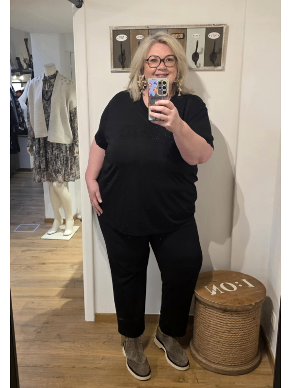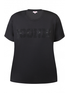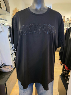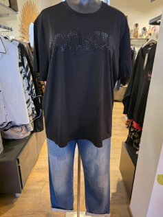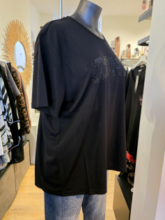 Très belle matière douce qui tombe bien sans coller pour ce tee-shirt noir avec inscription en brillants noir Iconic. En 63% viscose, 31% polyamide et 6% élasthanne. Hauteur environ 70 cm.