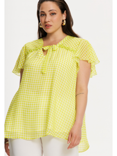 Coup de coeur pour cette blouse magnifique en voile impression vichy jaune. Avec des petites manches volantées. Le tissu est particulièrement de haute qualité et ne demande pas d'entretien. Elle est aussi doublée. Forme en A, on ne la sent pas donc en été ce sera très agréable à porter. En attendant vous pouvez la porter avec le tailleur Lush en suggestion pour un mélange d'imprimé à oser ! Hauteur environ 76 cm.