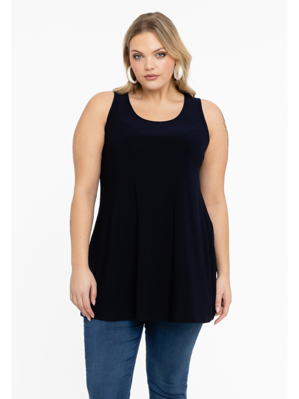 Long top en A de chez Yoek un grand classique. En jersey de polyester haut de gamme, forme évasée et environ 80 cm de haut. Toujours un bon article basique et durable à porter notamment avec le pantalon assorti en marine pour une base neutre et ensuite ajouter une veste ou un gilet plus fantaisie.