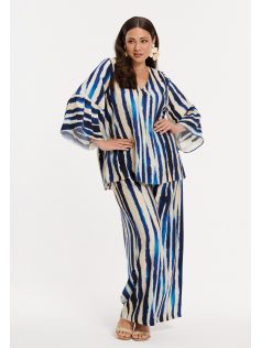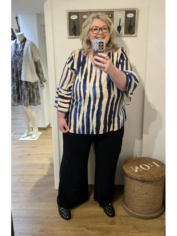 Magnifique tunique en lyocell (donc n'est pas extensible). C'est la blouse qui a le plus eu de succès en boutique. Il n'en reste qu'une en 54/56 mais contrairement aux autres blouses de la marque je dirais que c'est un 54 tout juste et donc plutôt un 52/54. Probablement parce que le tissu ne s'étend pas mais en tout cas il est d'une qualité et d'un tomber magnifique. A porter avec un pantalon marine pour un look sobre, chic, classe. Hauteur environ 70 cm.