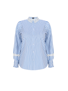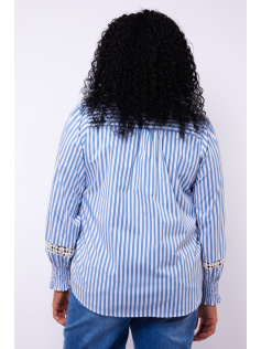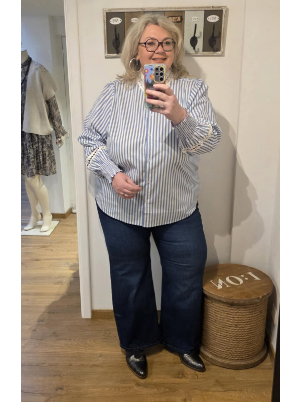 Un vrai coup de coeur poru ce chemisier ligné bleu et blanc avec de la dentelle au col et aux manches et le poignet smoké. En 50% coton et 50% polyester. Hauteur environ 69 cm.