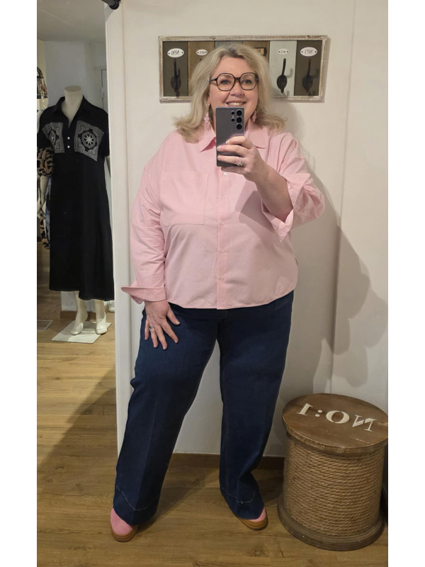 La chemise bleu ciel style chemise d'homme revisitée en plus court et un peu plus large avec les pans arrondis. On peut aussi la porter ouverte en petite veste avec les manches retroussées. En 100% coton. Hauteur : 70 cm.