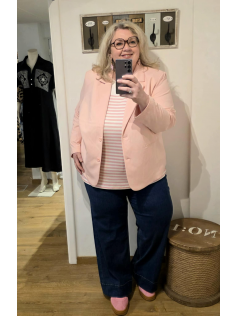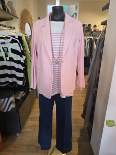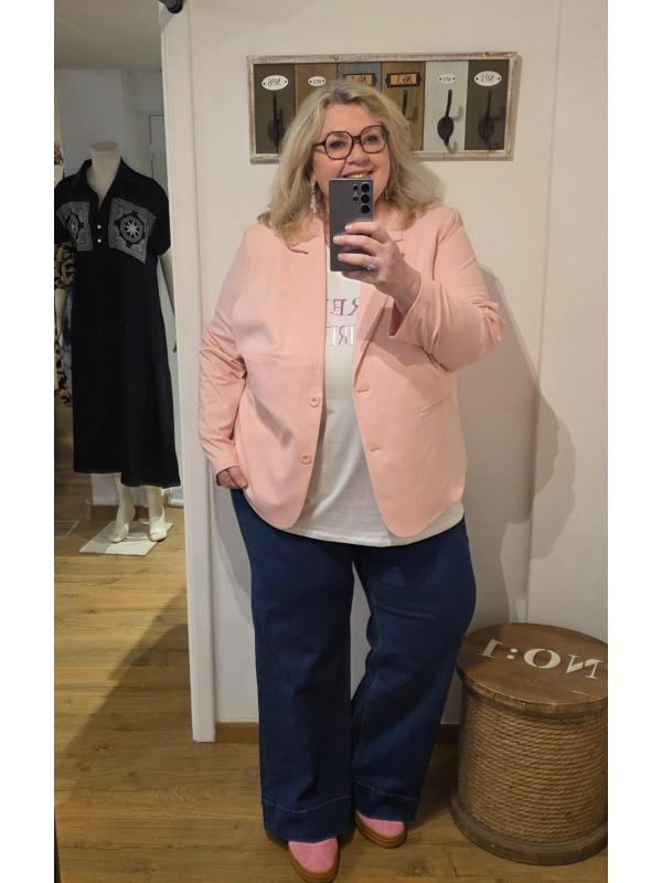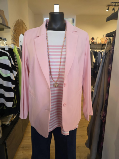 Blazer rose très pâle en matière technique 75% polyamide et 25% élasthanne. Hauteur : 70 cm. Coupe et tomber impeccable, un vrai coup de coeur.