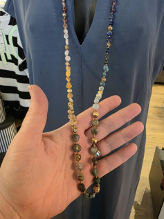 Long sautoir composé de multitudes de pierres naturelles. Avantage : il va avec tout !