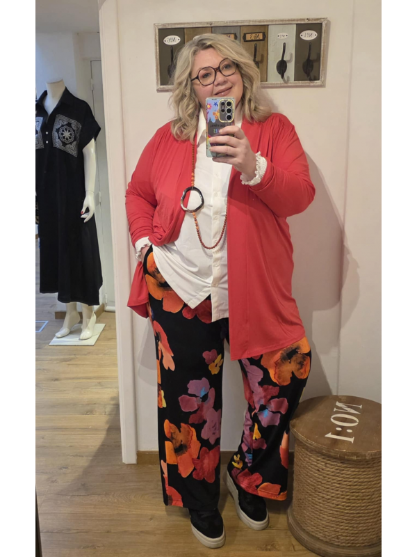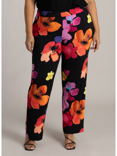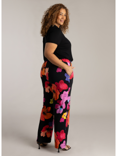 Superbes couleurs et imprimé pour ce pantalon fluide et extensible, facile à enfiler. Fond noir. En 95% polyester et 5% élasthanne. Entrejambe : 80 cm.