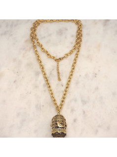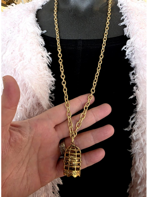 Adorable sautoir en forme de cage à oiseaux avec une petite boule à l'intérieur (on sait ouvrir la cage). Il est en laiton et au design unique.