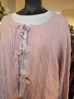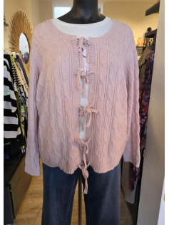 Pour réchauffer vos tenues de printemps, le rose pâle est à l'honneur. Ce petit gilet est torsadé et se ferme par des petits noeuds. Il est tout doux et encore un peu chaud. En 55% acrylique, 28% nylon, 15% alpaca et 2% élasthanne.