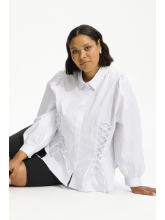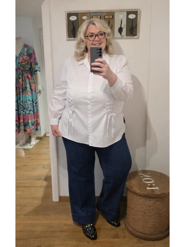 Chemisier blanc cintré avec des petits lacets sur le devant et de belles manches larges très féminines. Pour changer du chemisier classique. En 100% polyester. Hauteur : 69 cm. Impeccable !