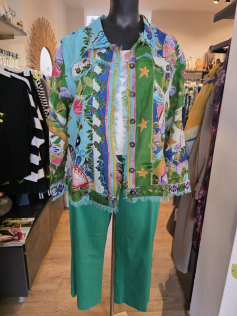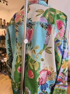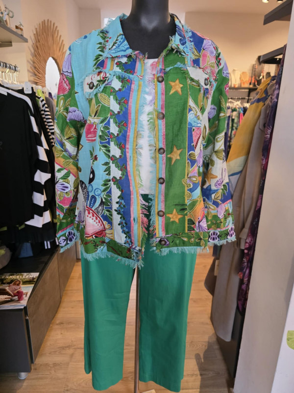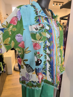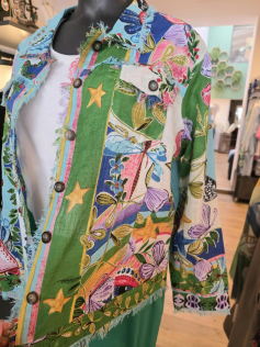 Petite veste en coton avec des petites franges discrètes dans un imprimé absolument fabuleux. En fait c'est un peu comme une petite veste en jeans mais en plus léger qu'on peut porter sur beaucoup de choses et de couleurs différentes. Hauteur : 66 cm.