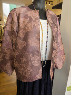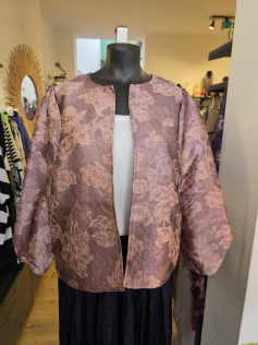 Superbe veste imprimée aux reflets mordorés. A porter habillée avec un top et un pantalon pour une fête, une cérémonie. Mais en 2026 on fait ce qu'on veut alors vous pourrez aussi la porter avec un top et un jeans ou une jupe.