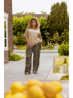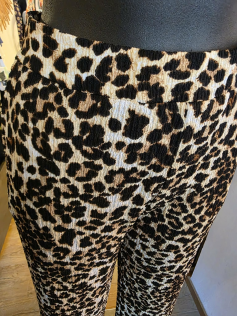 Pantalon fin en tissu texturé léopard. Très agréable à porter. Superbe avec le tee-shirt assorti en suggestion. En 95% polyester et 5% élasthanne. Entrejambe : 80 cm.