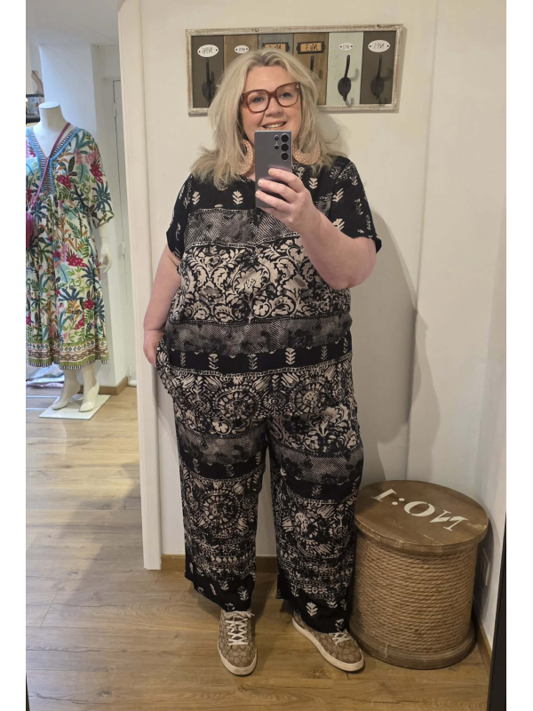 Petite blouse facile à porter à prix doux. En 100% viscose. Longueur : 70 cm. Ensemble super pratique avec le pantalon assorti en suggestion.