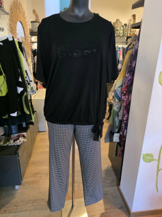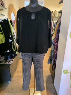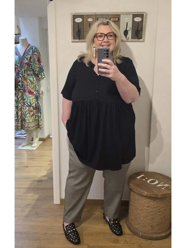 Pantalon noir texturé un peu épais. Noir et blanc. Taille toute élastiquée. Attention il taille très grand. Prenez une taille inférieure à votre taille habituelle. Convient aux cuisses plus fortes. En 39% polyester, 31% coton et 22% polyester et 3% élasthanne. Entrejambe 77 cm.