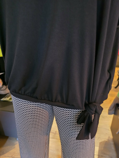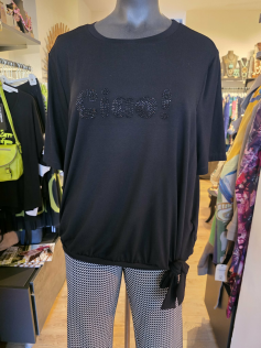 Blouse en jersey de viscose de haute qualité. Inscription avec brillants sur le devant (ciao) et resserrée dans la bas avec un noeud pour un effet plus habillé mais pas trop. Hauteur environ 67 cm.