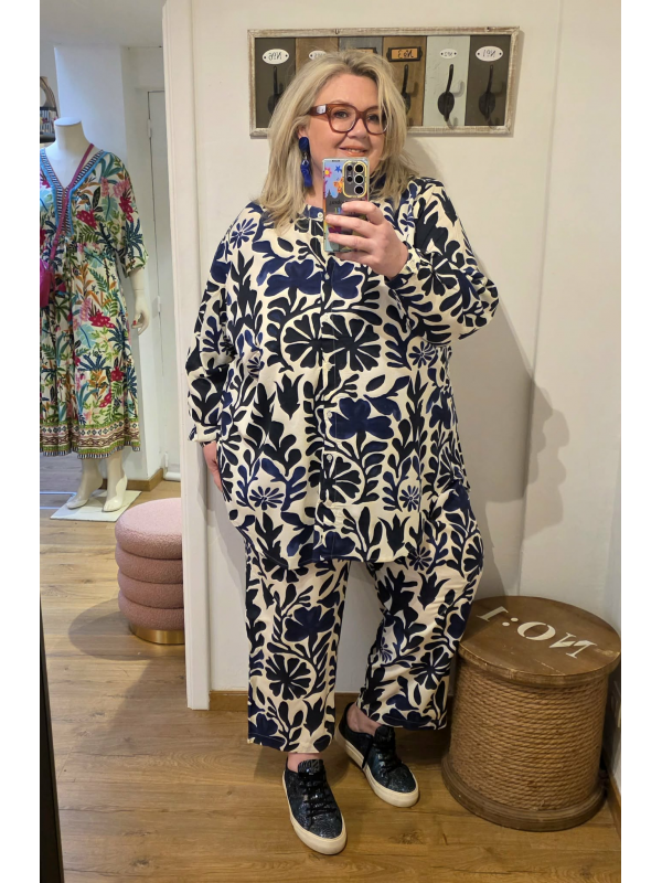 Longue tunique toute boutonnée en 100% viscose dans un imprimé magnifique. On peut la porter avec le pantalon assorti mais aussi avec un jeans, un pantalon blanc, ecru, noir, marine... son imprimé fonctionne avec tout. Hauteur environ 83 cm.