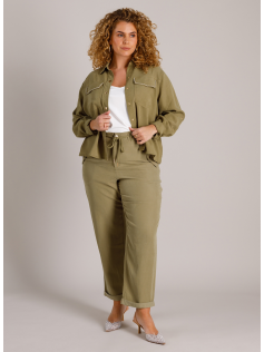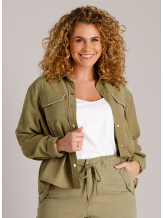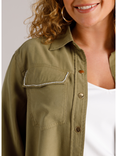 Surchemise courte un peu comme une petite veste en jeans. Tissu aspect lyocell doux et velouté. poches plaquées avec brillants. En 93% viscose et 7% polyester. Hauteur 64 cm. Pantalon assorti en suggestion.