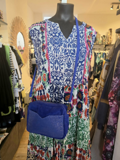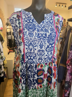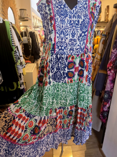 Magnifique robe de chez Orientique, que vous porterez tout l'été, même avec un petit gilet, un boléro ou une veste en jeans. Le tissu en coton est chiffonné et pour garder cet aspect plissé, vous pouvez la conserver enroulée dans votre dressing. Hauteur environ 128 cm.