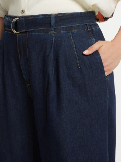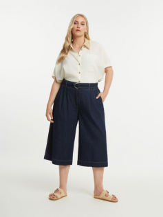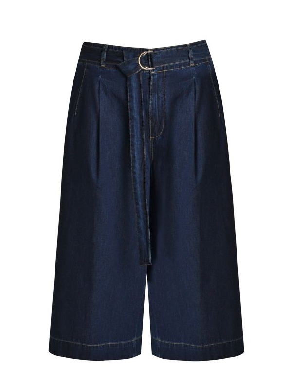 Jupe culotte en coton en denim très foncé avec ceinture élastiquée et une ceinture (qu'on peut retirer si on n'a pas envie de la porter). Elle est vraiment chic et peut faire des looks à l'infini. Entrejambe : 55 cm.