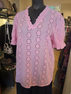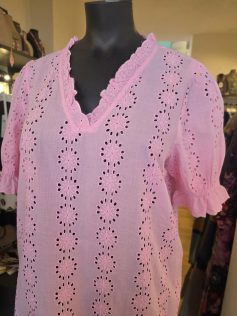 Petite blouse en rose hyper tendance en broderie en anglaise. En 100% coton. Hauteur environ 72 cm.