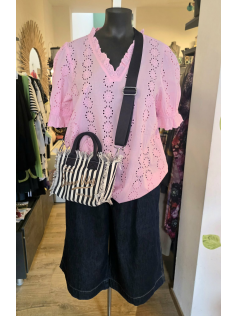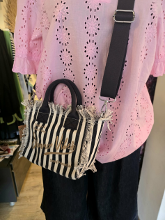 Adorable petit sac pour ne pas être encombrée en toile de coton bleu marine et blanc cassé. Avec fermeture éclair et grande bandoulière réglable. 24 cm de large sur 18 cm de haut.