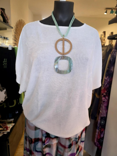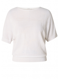 Adorable petit pull blanc assez passe-partout mais avec une texture et un dessin ton sur ton. Manches sans emmanchures. En 45% viscose, 42% lyocell et 13% nylon. Hauteur : 70 cm.