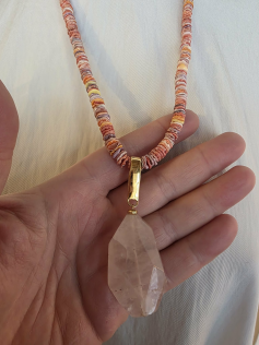 Merveilleux collier avec un médaillon en quartz rose et des coquillages Pecten Nobilis. Une création originale de Nature Bijoux;